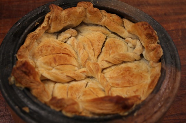 * Milföy hamurunu güvecin üzerine kapatın. Hamurunuz güvecin içine girecek, kenarları içine doğru kıvrılacak , Kestiğiniz şeritleri hamurun üzerine hayal gücünüzle süslediğiniz şekilde yerlestirin, bıçağınızla hamurun üzerinde küçük izler verin ve 180 derecelik firinda 30 – 40 dakika kadar pişirin