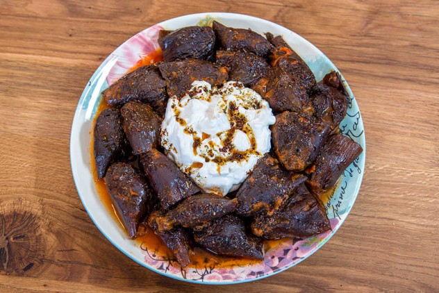 Ayçiçek yağını da patlıcanların üzerine gezdirin, üzerine tencerenizin boyutlarına uygun bir tabağı ters kapatın ve 50 – 60 dakika kısık ateşte tencerenin ağzı kapalı şekilde pişirin.