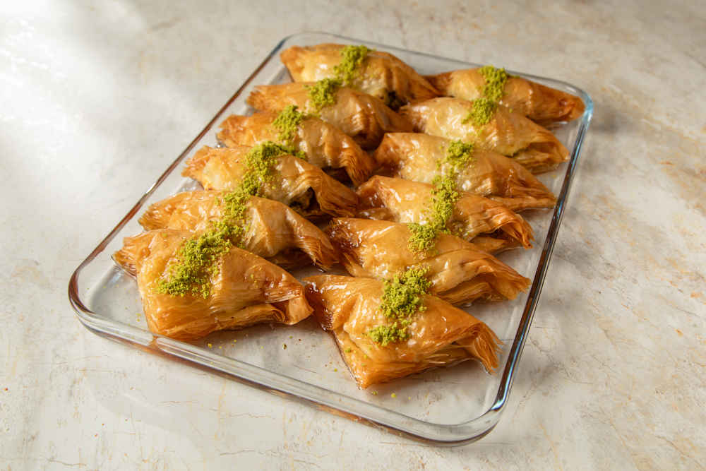 Her bir karenin ortasına önce antep fıstığı ardından da 1 tatlı kaşığı kadar irmikli karışımdan koyup üçgen olacak şekilde kapatın.