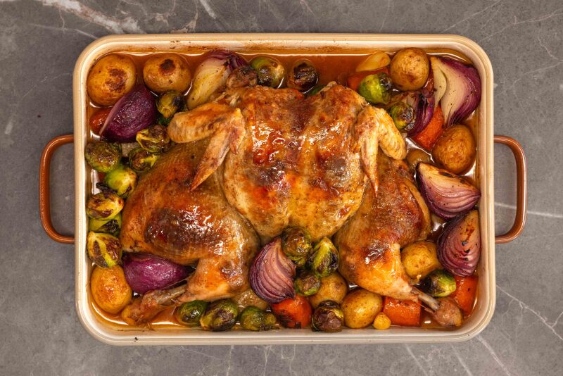 • Tepsiye, kenardaki mor soğan ve Brüksel lahanalarını ekleyin. Tavuğun yağını fırçayla üzerine ve sebzelere sürün.