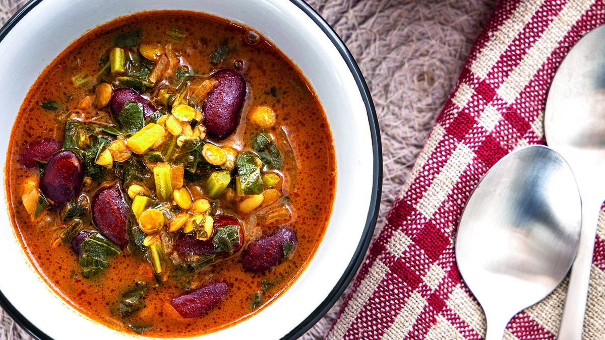 Et suyunu ekleyin ve kaynamaya bırakın. Kaynadıktan sonra kara lahanayı, beluga mercimeğini, kırmızı mercimeği ve haşlanmış kırmızı fasulyeyi ilave edin. Orta ateşte yaklaşık 15 dakika pişirin.