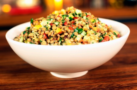 Dolma biberleri, havuç, domates, salatalık ve portakalı mercimek ebadından biraz büyük olacak şekilde küp doğrayın.