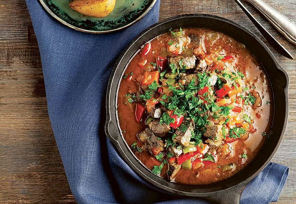 Yemeklik doğranmış domatesleri, ince kıyılmış biberleri ve haşlanmış dana ciğerini ekleyin. Tuz ve karabiberle tatlandırarak kısık ateşte yaklaşık 15 dakika pişirin.