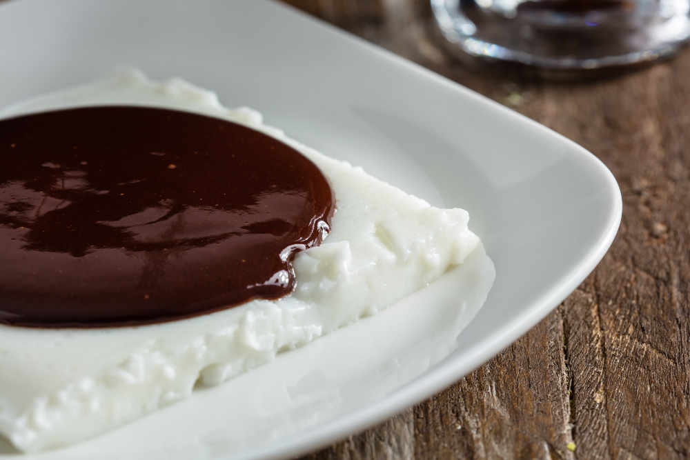 Soğuyan su muhallebinizden dilim çıkartın ve üzerine çikolatalı sos gezdirerek servis edin.