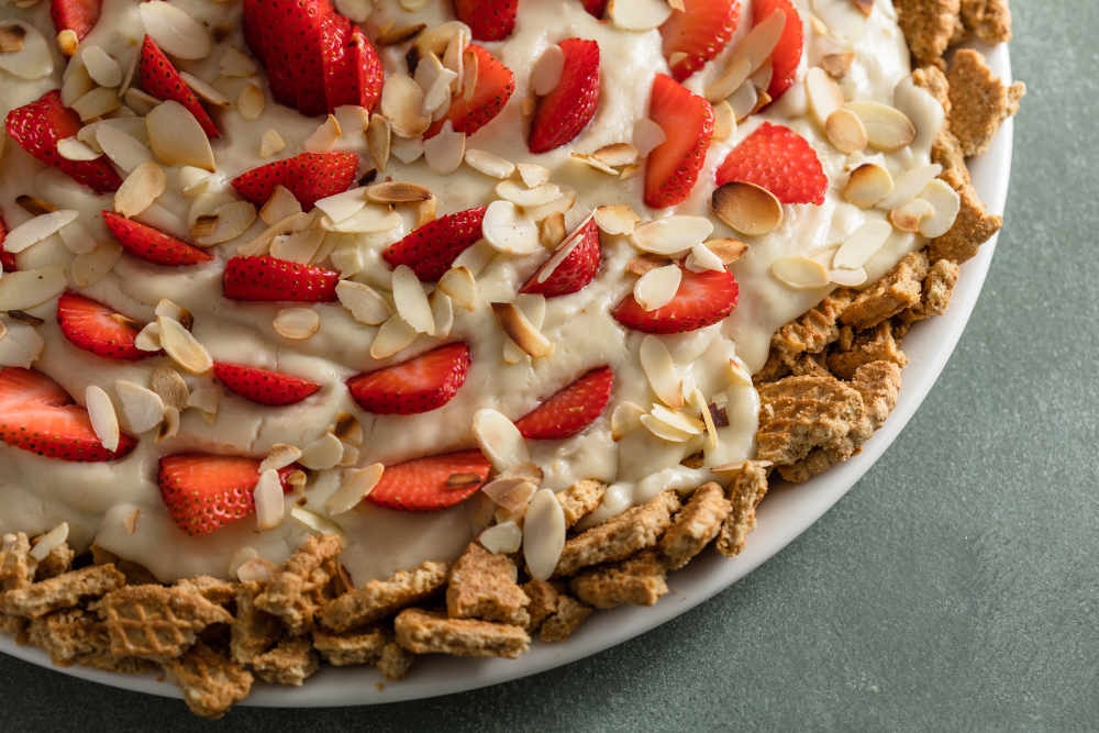 Muhallebinizin üzerine dilimlediğiniz çilekleri dizin.