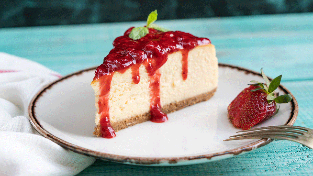 Soğuyan çilek sosunu cheesecake'in üzerine döküp yayın. İsteğe göre nane filizi ile süsleyip dilimleyerek servis edin.