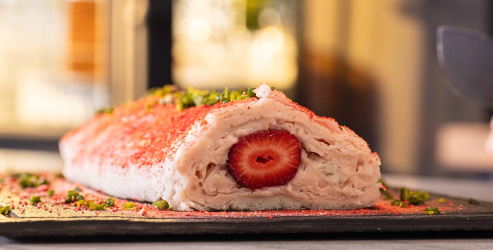• Üzerine dondurulup kurutulmuş çilek rendeleyin. Biraz da boziç serpince hem hafif hem aşırı lezzetli güllaçtan rulo pasta hazır.