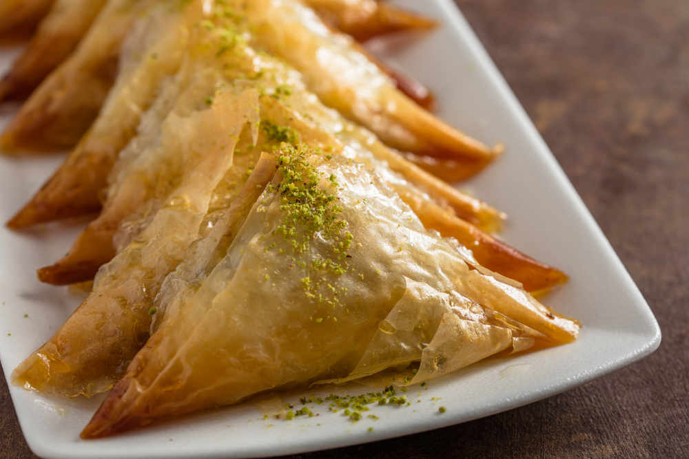 Üzerine toz antep fıstığı serpiştirin ve muska şeklinde sarın.