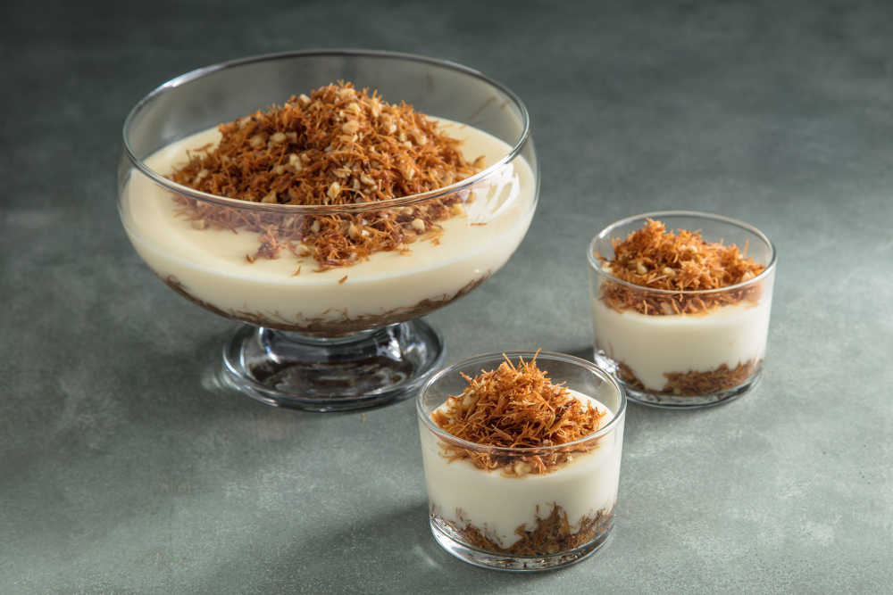 Hazırladığınız kadayıflı kaselerinizin üzerine muhallebinizi pay edin.