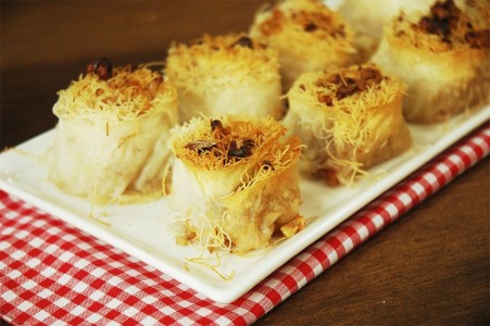 Tezgaha yufkayı serin. Cevizden 2 yemek kaşığı ayırıp, yufkanın üzerine serpin. Tel kadayıfı didikleyip, yufkanın üzerine serpin. Yufkayı rulo şeklinde sarın.