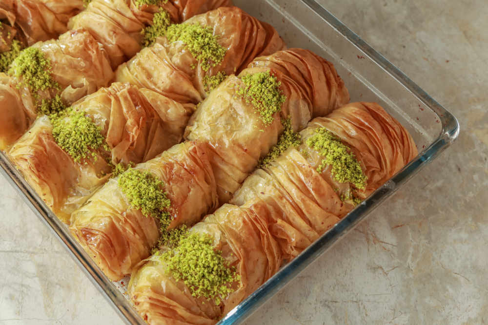 Bütün baklava yufkalarını bu şekilde hazırlayın ve yağladığınız cam fırın kabına dizin.