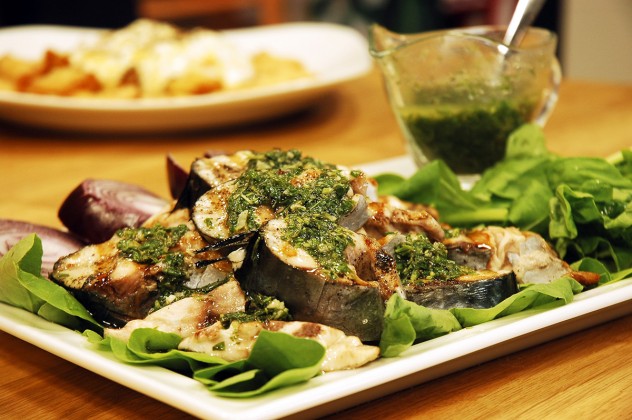 Sos için; tüm taze baharatları saplarından ayırın ve yapraklarını ince kıyın. Sarımsakları da kıyıp, ezin ve bu karışıma ekleyip,son olarak limon suyu,tuz, karabiber ve zeytinyağı ile harmanlayıp sos elde edin ve balığın üzerine dökerek servis edin.