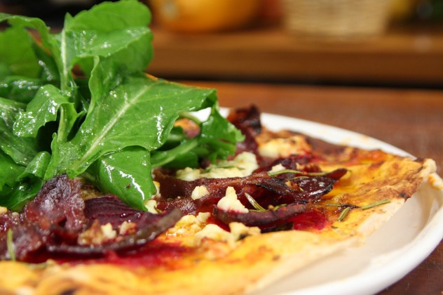 Haşlanmış pancarları istediğiniz şekil kesip , balzamik,tuz ve karabiberle tatlandırın.Pizza hamurunun üstüne önce taban sosunu, sonra pancar,dil ve peynirleri serpiştirin.Biberiyeyle tatlandırıp,180 derecelik fırında 8-10 dakika pişirin.