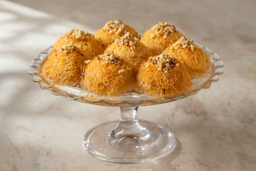 8 cm.’lik bir sos kasesinin içerisine birkaç tutam kadayıf koyup üzerine bastırın.
