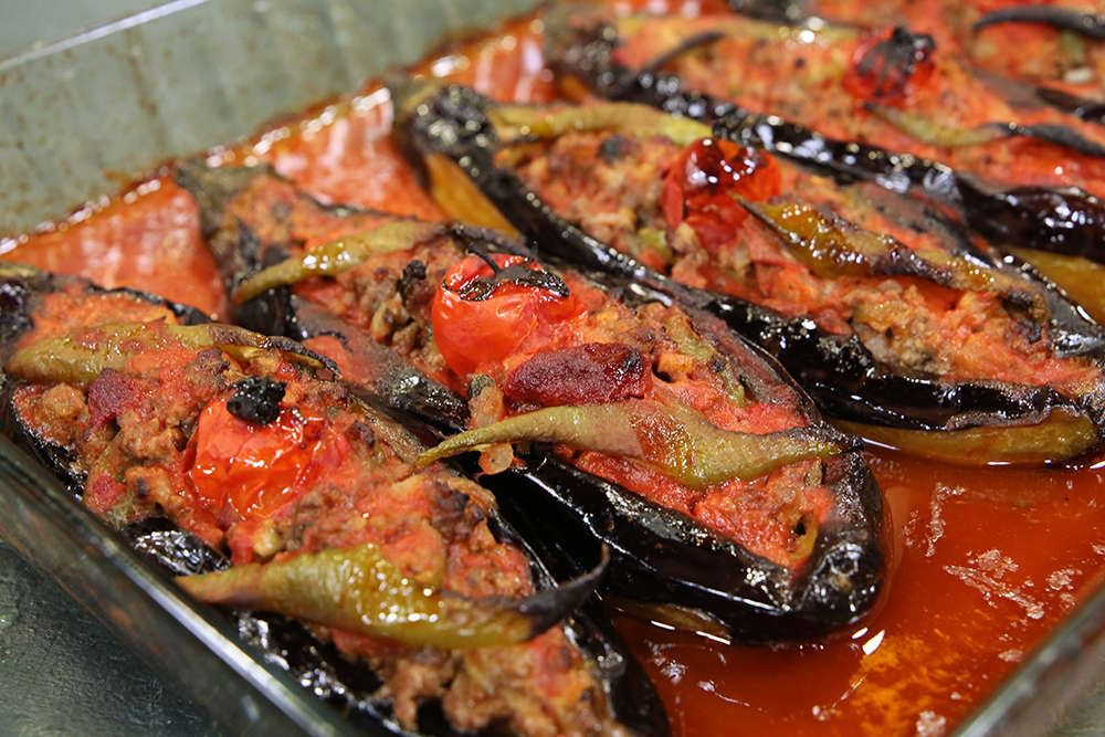 Kızartılan patlıcanların ortası hafifçe açılarak hazırlanan kıymalı harç içlerine dolduruluyor. Üzerleri domates ve biber dilimleriyle süsleniyor. Tepsiye yerleştirilen patlıcanların üzerine önceden kaynatılmış 2 bardak su dökülüyor.