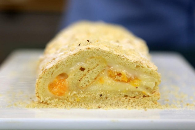 Üst kısımda kalan yağlı kağıdı sıyırın ve taban kısmı sıcakken rulo şeklinde sarıp soğumaya bırakın.
