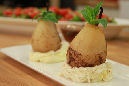 Armutların kabuğunu saplarını üzerinde bırakarak soyun. Oyucu yardımıyla çekirdeklerini çıkarın. Alt taraflarını bıçak yardımıyla keserek düz durmalarını sağlayın. Hazırladığınız cevizli karışımı, armutların oyuk kısımlarına doldurun. Yıldız anasonları tezgaha koyup, armutların kestiğiniz tarafını anasonlara bastırın ve içine gömülmelerini sağlayın.