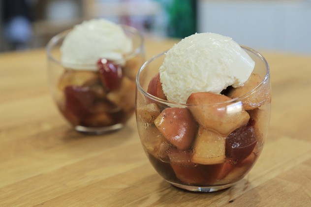 200 dereceye önceden ısıtılmış fırında 20-25 dakika pişirin. Meyveleri servis kaplarına alıp üzerine kaymak koyarak servis edin.