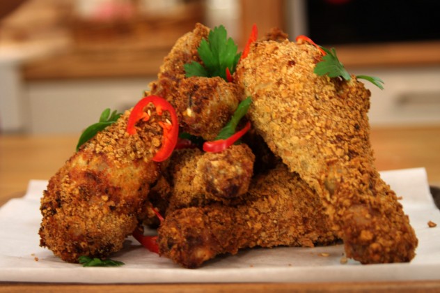 Baget tavukları tuzlayın. Önce una, sonra yumurtaya ve en sonda baharatlı karışıma bulayın.