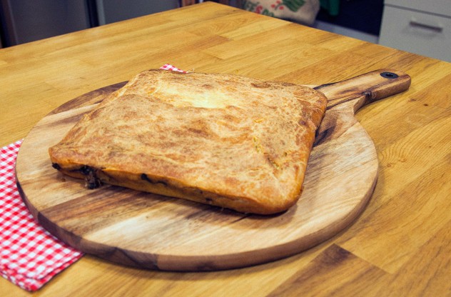 Üzerine hazırladığınız kıymalı, mantarlı harçın tamamını dökün ve hamurun kalanını da en üstüne döküp yayın.