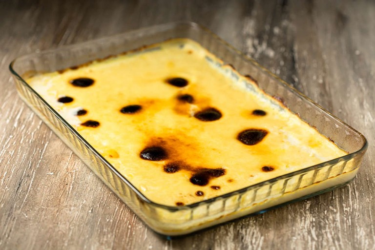 Hazırladığınız sütlü karışımı dikdörtgen cam fırın kabınıza dökün ve 180 derecede önceden ısıtılmış fırının en üst rafının bir altında üstü kızarana kadar 10 – 15 dakika pişirin.