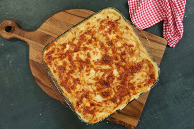 Daha önceden haşladığınız makarnanızı, bu peynirli beşamelin içerisine ilave edip iyice karıştırın ve bir fırın kabına aktarın.