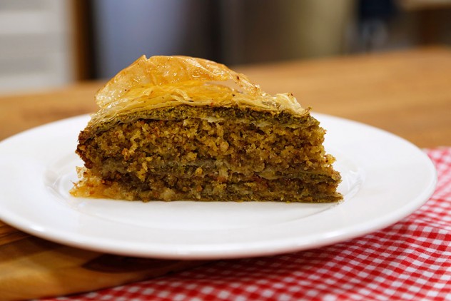 Üzerine 5 kat yağlanmış yufka, fıstık ve yeniden 5 kat yağlanmış yufkayı yerleştirin. Kekin 2. Parçasını yerleştirin. Yeniden 5 kat yağlanmış yufka, fıstık ve 5 kat daha yağlanmış yufka yerleştirip, en üstüne tereyağı sürün ve dilimleyin.