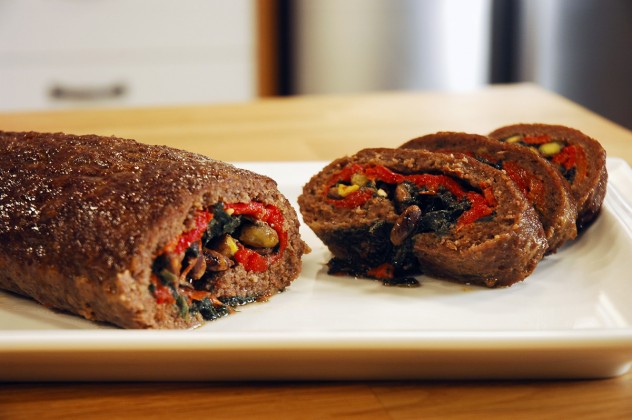Streç filmin ucundan tutarak uzun kenardan başlayarak rulo şeklinde yuvarlayın. Yağlanmış fırın tepsisine koyun. Üzerine yumurta beyazı sürüp 180 derecede önceden ısıtılmış fırında 45 dakika pişirin.