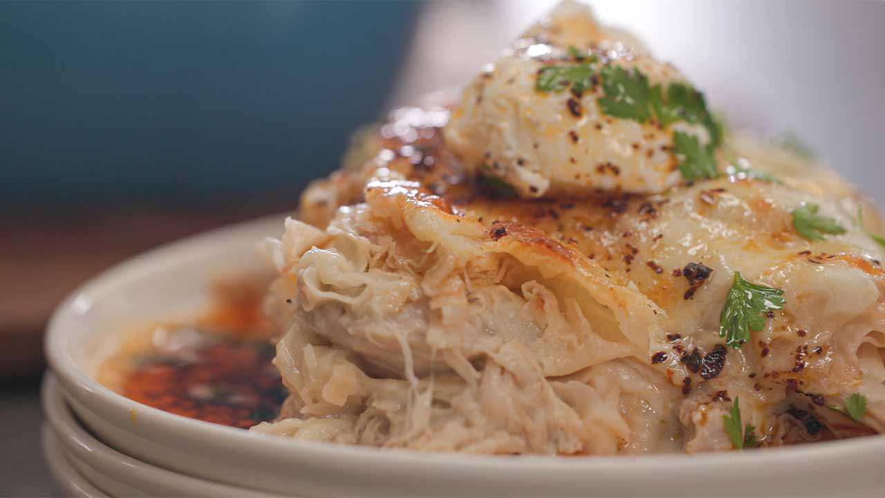 • Aynı şekilde tekrar yufkaları serip bastırın ve tavuk suyundan 1 kepçe gezdirerek ıslatın. Kalan tavukları ve yine aynı miktarda paçadan döküp iyice yayın. En üst kat için de kalan yufkaları ekleyip üzerine 1 kepçe tavuk suyu gezdirin ve kalan paçayı yayın.