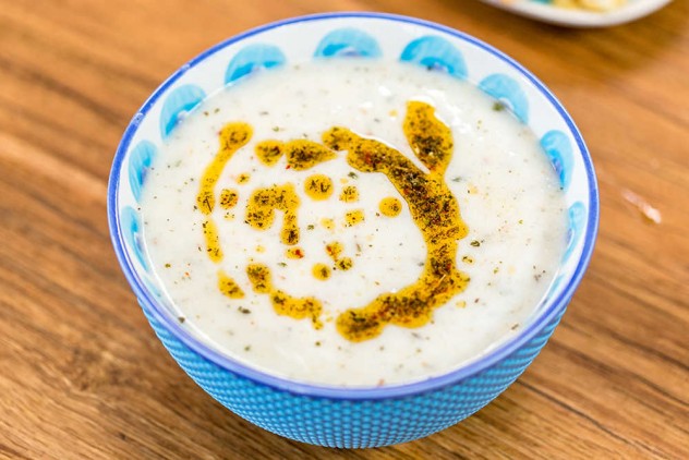 Sosu için, süzme yoğurt ve unu bir kasede çırpın, çorbanın suyundan azar azar ekleyerek ılıttığınız bu sosu, çorba tenceresine karıştırarak ilave edin.