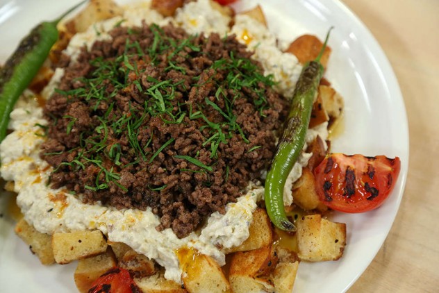 Üzerine kavrulmuş kıymayı ve 1 tutam kıyılmış maydanozu serpin.