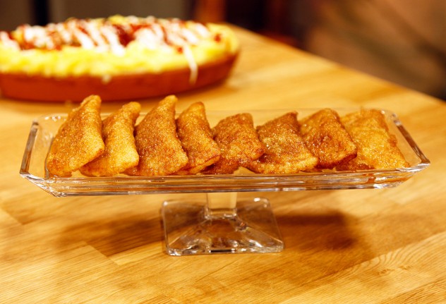 Pişen hamurlar tamamen soğumadan pişmemiş olan tarafına iç harcını koyup çatalla bastırarak kapatın.