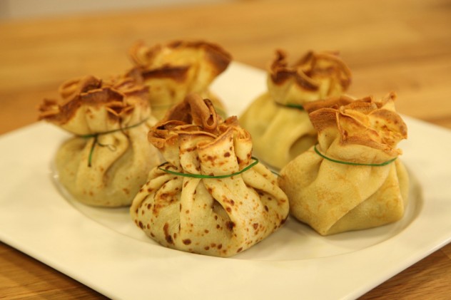 Hazırladığınız kreplerin ortalarına etleri paylaştırın. Bohça seklini verin ve maydanoz saplarıyla bağlayın. Yağladınız fırın kabına dizin.