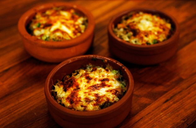4 güveç kabına pay edin. Üzerlerine rende peyniri bölüştürün.