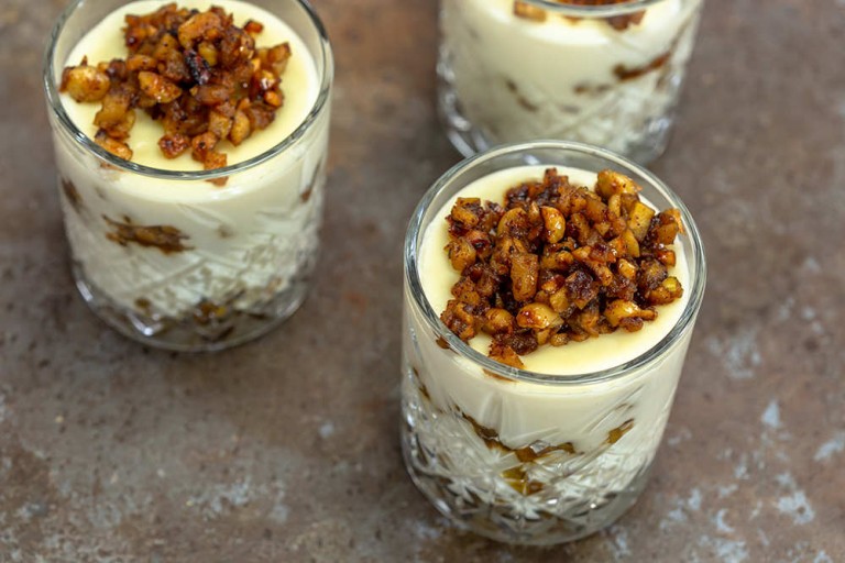 Servis edeceğiniz kapların tabanına 1 yemek kaşığı olacak şekilde elmalı harçtan koyun.