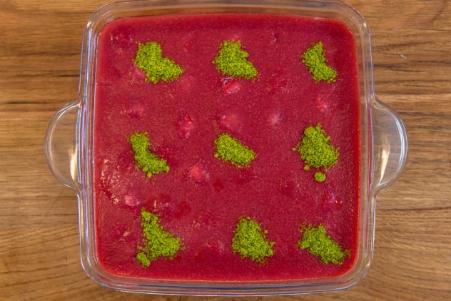 Üzerine toz antep fıstığı serpiştirin ve dilimleyerek, servis edin.