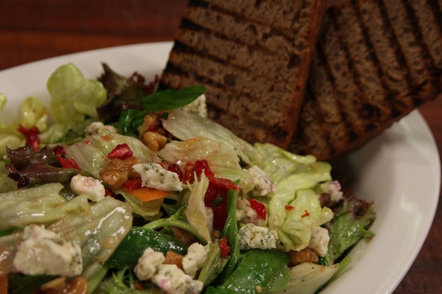 2 yaprak göbek salata 3 yaprak loloroso 3 yaprak endivyen 3 yaprak roka 5-6 adet taze nane yaprağı 5-6 adet taze semizotu 1 havuc 1 salatalık 3-4 adet kurutulmus domates 2 Dilim kızarmış ekmek Ceviz içi Keçi peyniri Nar