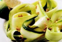 Kabakların kabuklarını soyup doğrayın. 1 su bardağı su ve bir miktar tuz ile, fazla yumuşamadan haşlayın. Aynı şekilde biberleri de ayrı bir kapta, 1 su bardağı su ve tuzla haşlayın. Sebzelerin diri kalması, salatanın lezzetini artırır.