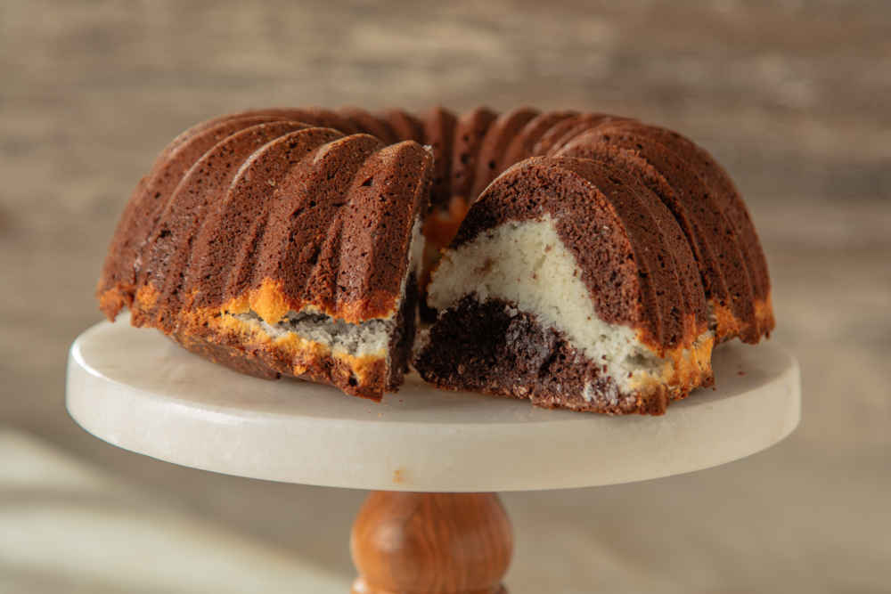 Yağladığınız kek kalıbına kek harcının yarısını bir dondurma kaşığı yardımıyla pay edin.
