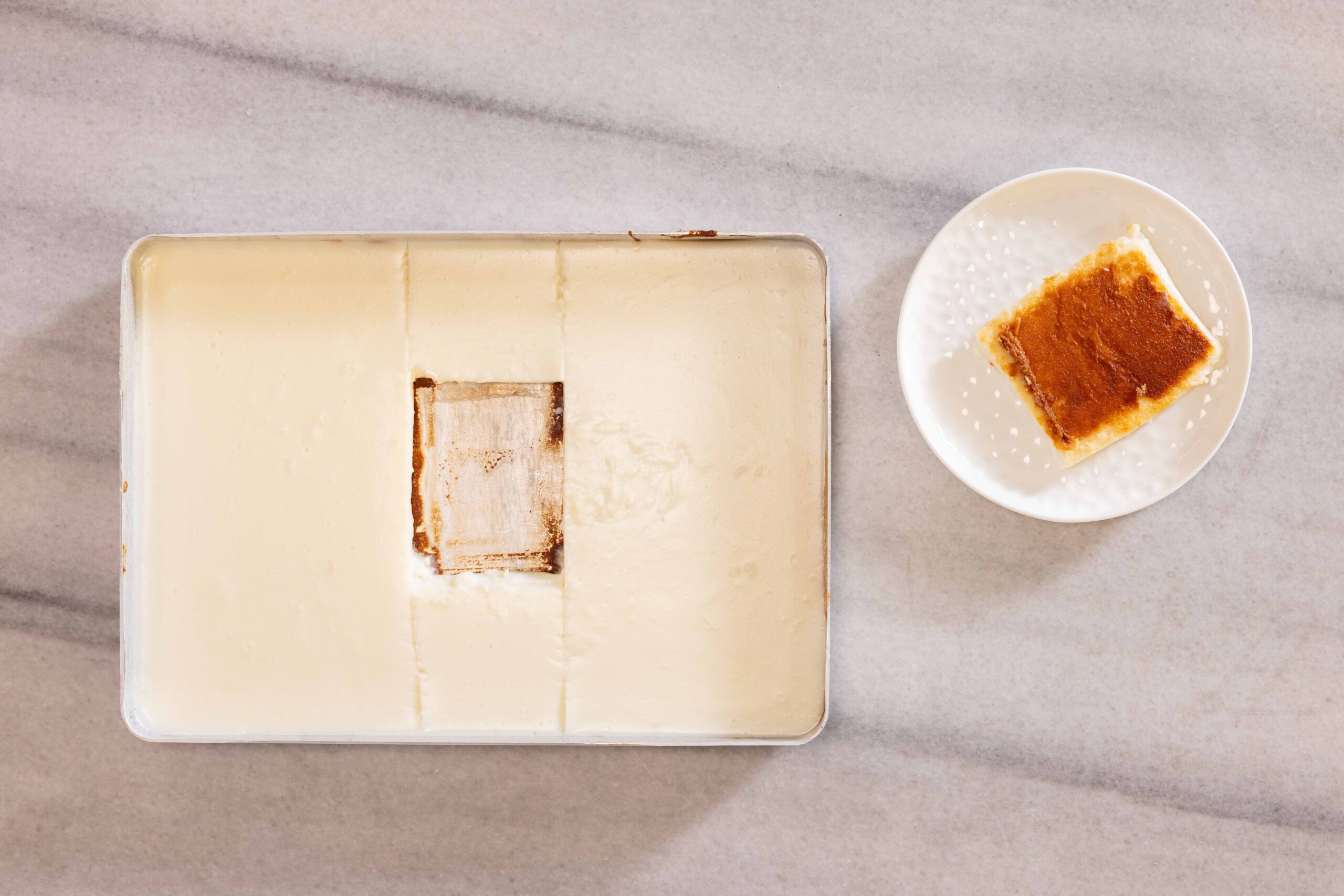 • 3-4 dakika sonra, tüm tabanı tutup kahverengi olunca ocaktan alın ve üzerine kalan muhallebiyi dökün. Tepsiyi birkaç kez tezgâha vurup üzerini düzleyin.