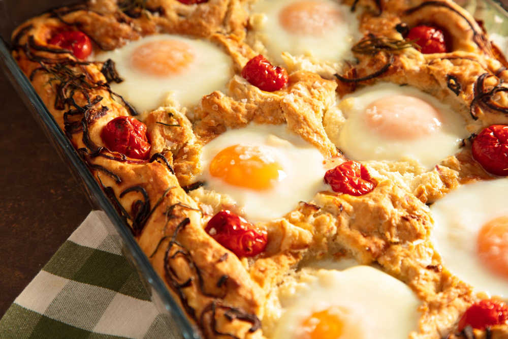 Domateslerin yanlarına biberiye yaprakları ve piyazlık doğranmış soğanları yumurta kıracağınız yerlere denk gelmeyecek şekilde yerleştirip elinizle iyice hamurun içine bastırın.