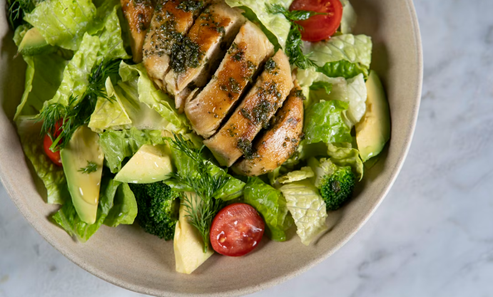 Tavuk göğsünü ince dilimler halinde kesin. Üzerine zeytinyağı, tuz ve karabiber ekleyerek marine edin. Izgara tavada orta ateşte her iki tarafını yaklaşık 3-4 dakika pişirin ve dinlenmeye alın.