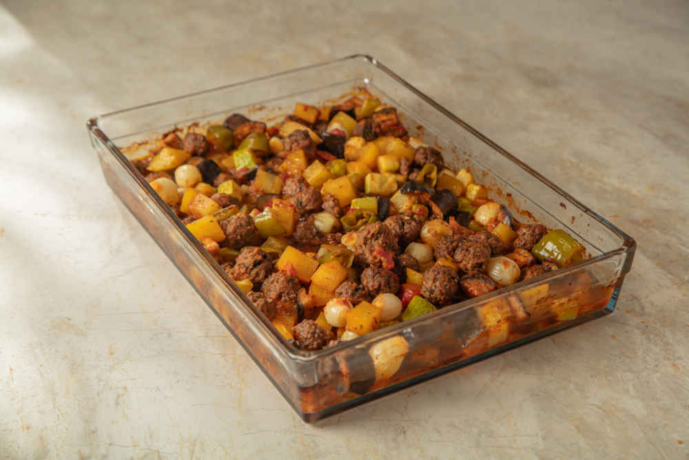 Sosun üzerine iri küp doğradığınız patates, iri doğranmış biber, iri küp doğranmış kabak, iri küp doğranmış patlıcan, soyulmuş arpacık soğan ve iri dilimlediğiniz sarımsağı ilave edip harmanlayın.