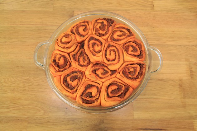 Acukanızı hamurun üzerine düzgün bir şekilde sürün, hamuru rulo şeklinde, bitmiş hali ince uzun bir form alacak şekilde rulo yapın.