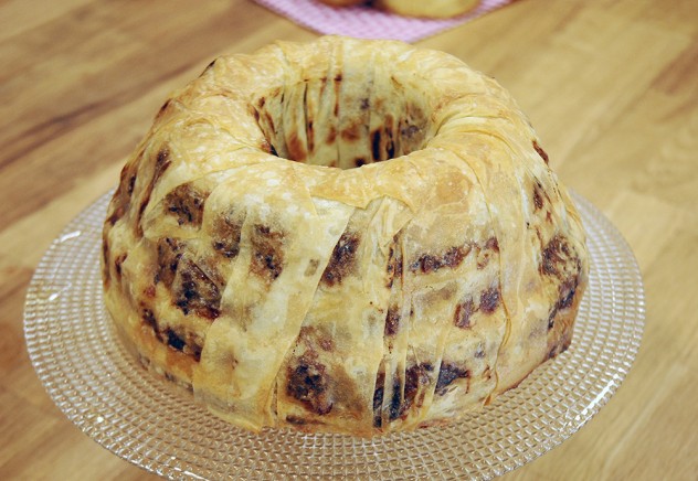 Kek kalıbının içine 3 kat parça yufka serin aralarına da sıvı harçtan sürün. Hazırladığınız kıymalı harçtan dökün, yayın. Ardından yeniden parça yufkalardan serin, sıvı harçtan dökün ve yufkalar ve iç harç bitene kadar bu şekilde devam edin.