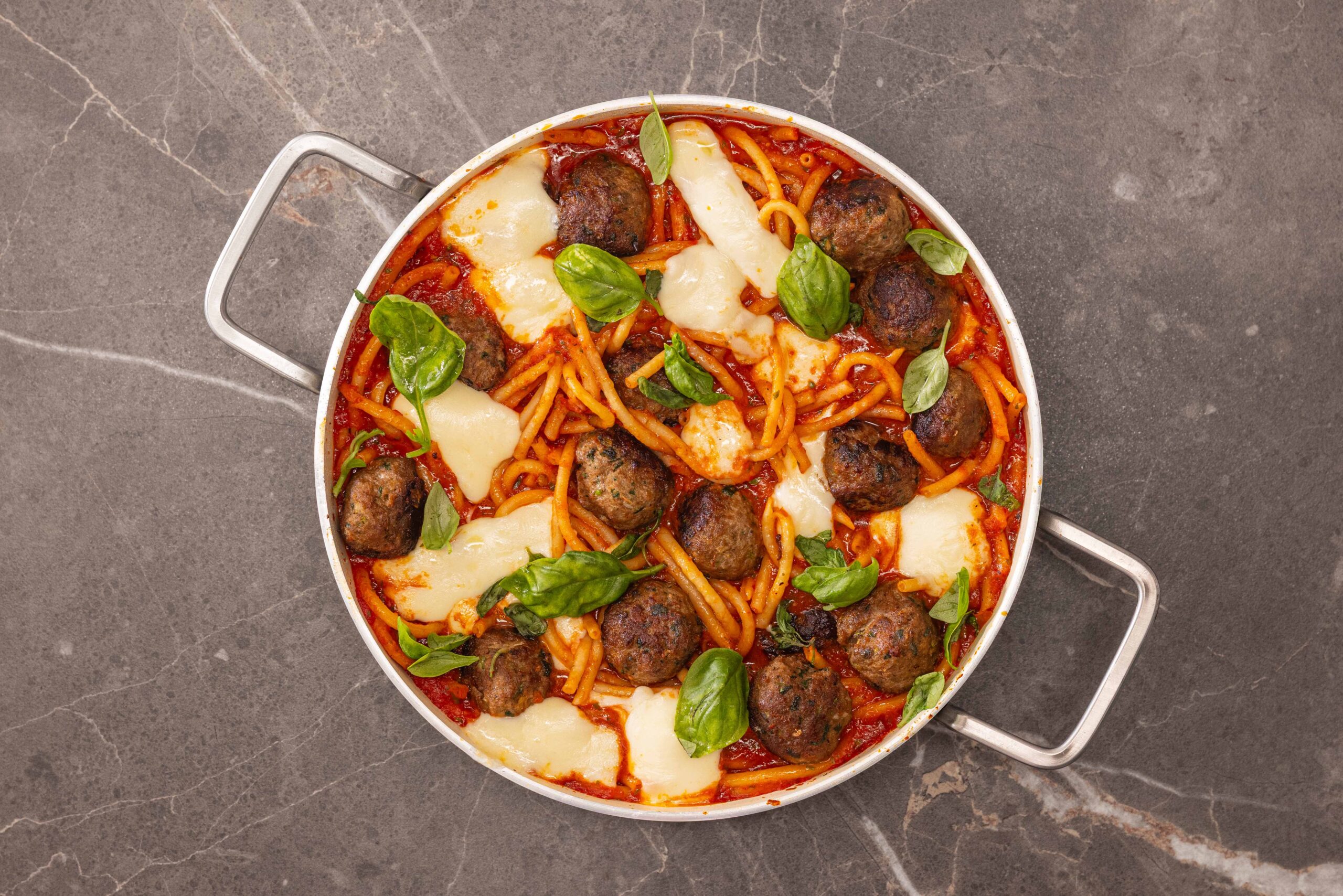• Tencereye köfteleri ve 2 boğum dil peynirini büyük parçalar halinde ekleyin. Yarım avuç fesleğen yaprağını serpin. Yerleştirirken birkaç köfteyi ve peynirin birazını makarnanın içine doğru itin.