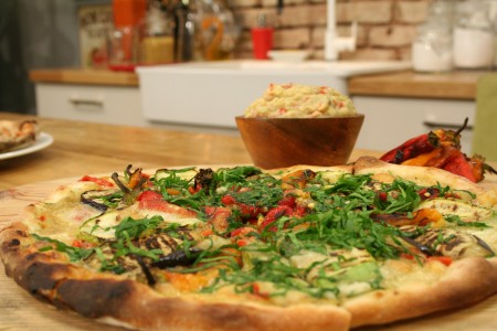 Hazırladığınız beğendiği kaşığın ters tarafıyla hamura sürün. Sirkede bekletilmiş köz biberi parçalayarak serpiştirin. Mozarella peynirini üstüne dağıtın. Izgara patlıcan ve kabağı dizin. En üstüne ızgara sarı ve kırmızı biberleri istediğiniz şekilde keserek dağıtın.