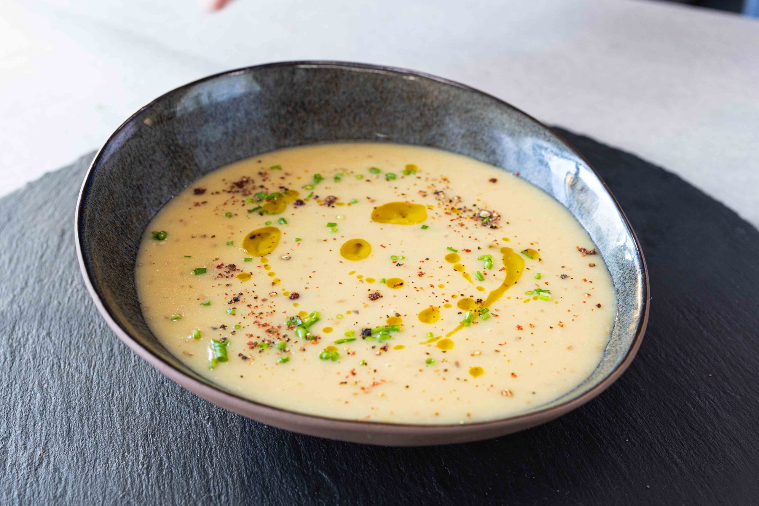 • Servis ederken kaselere koyduktan sonra üzerine ince kıydığınız 8-10 dal frenk soğanını ve karabiber serpin. Dilerseniz azıcık daha trüf yağı gezdirince hem trüflü hem köz tadıyla nefis sarımsak çorbası emrinize amade.