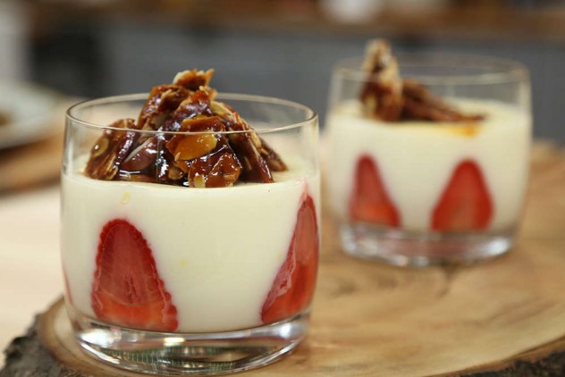 Çileklerin üç tanesi hariç kalanını dikine ikiye bölün bardağınıza muhallebiyi koymadan çileklerin iç kısımları bardağın dış kısmına bakacak şekilde paylaştırarak yerleştirin.