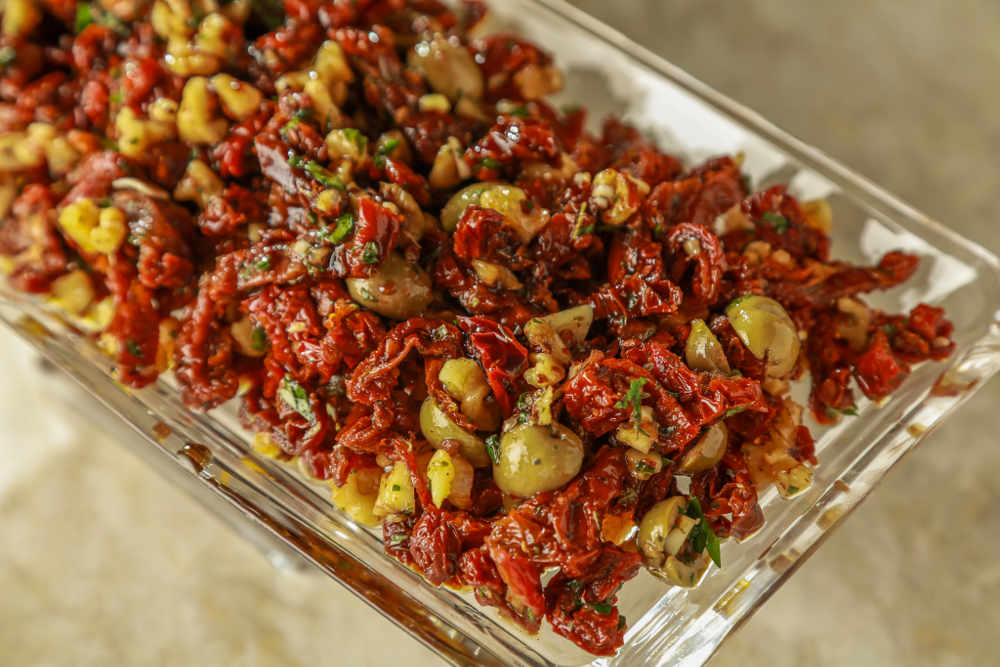 Bir karıştırma kabına ince dilimlediğiniz kuru domatesleri alın.